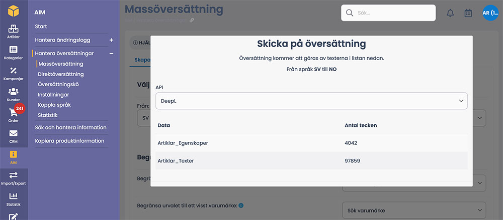 Massöversättning hittar du under Hantera översättningar i AIM-menyn.