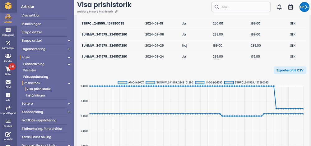 Användande av Prishistorik V2 innebär också att man får tillgång till en ny vy och funktion i Askås Admin för att effektivt söka fram prishistorik för en eller flera artiklar.
