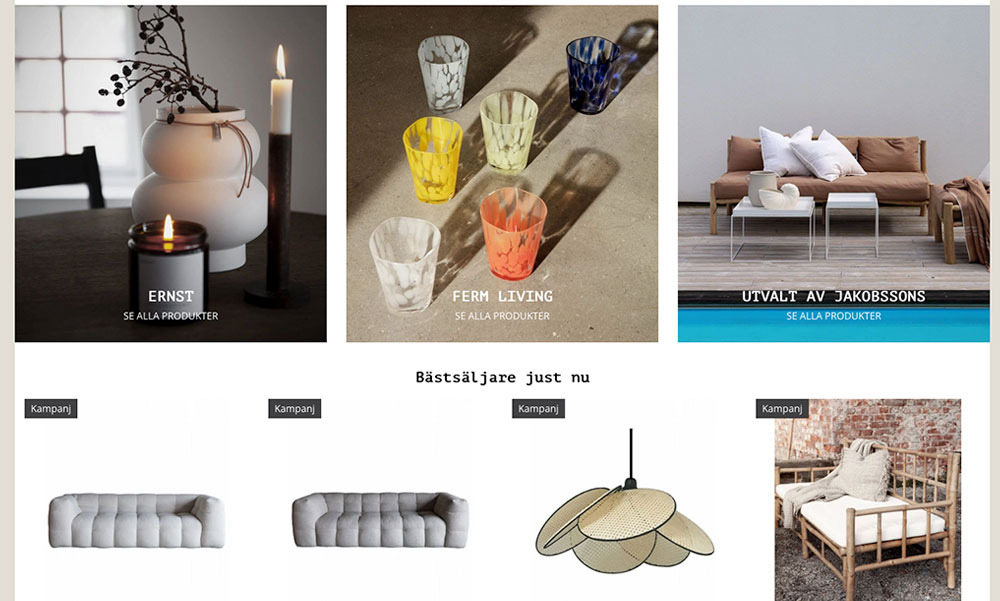 I sortimentet finns en lång rad varumärken och en mix av exklusiva produkter och kvalitativa möbler i lägre prisklasser.