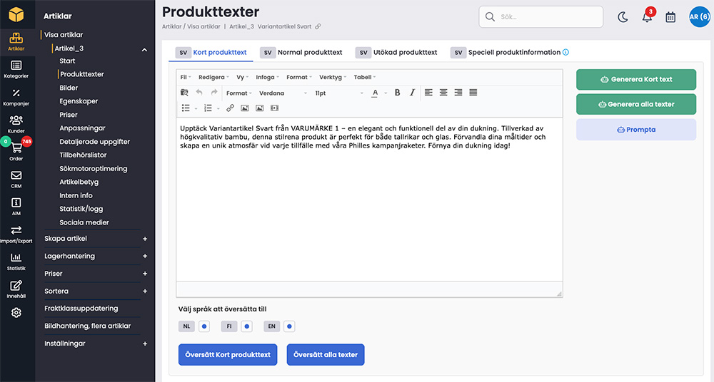 Ni kan först generera en eller flera texter på standardspråket och därefter översätta valda texttyper till alla eller ett urval av språk med ett knapptryck.