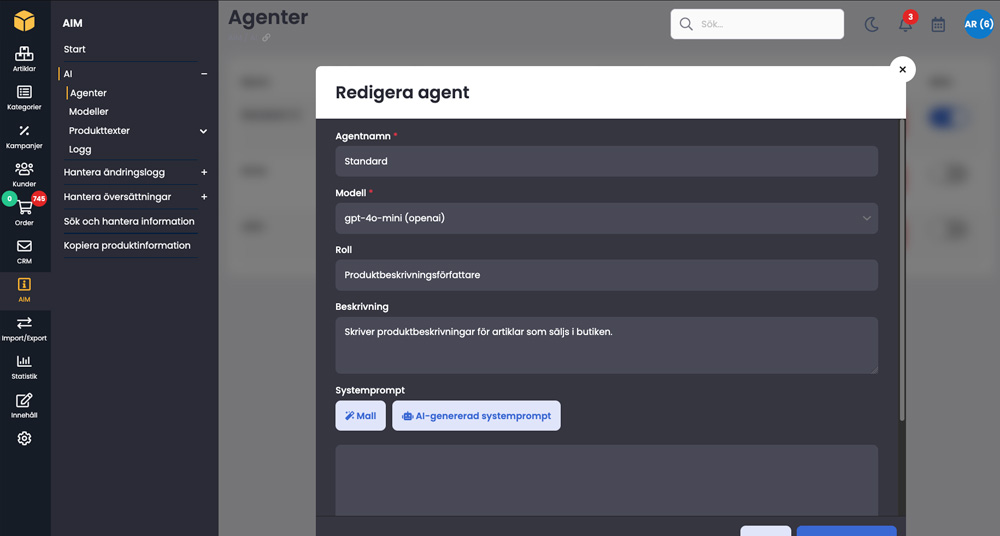 AI-agenter är en ny funktion där ni kan skapa agenter med tydliga instruktioner för hur produkttexter ska genereras.