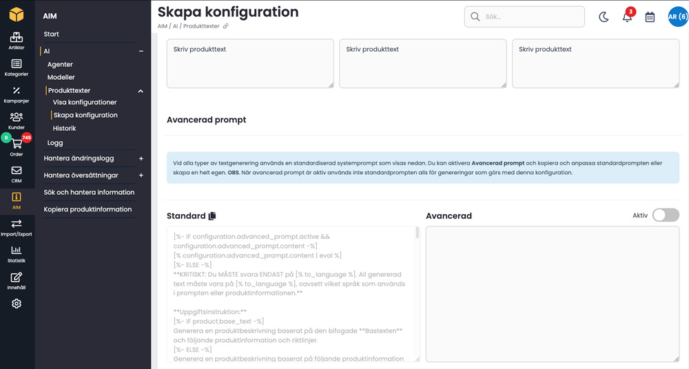 I konfigurationen väljer ni AI-agent, vilka artikelgrupper den ska gälla för samt kan vid behov justera eller ersätta standardprompten via avancerad prompt.