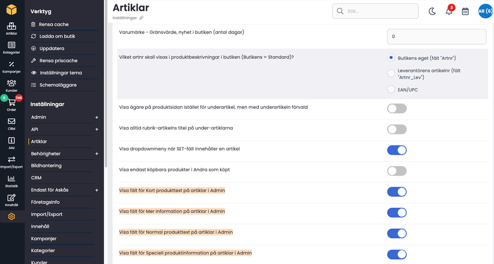 Ni kan nu styra vilka typer av produkttexter som ska visas i Admin via Inställningar → Artiklar, för att anpassa vyn efter ert arbetssätt.