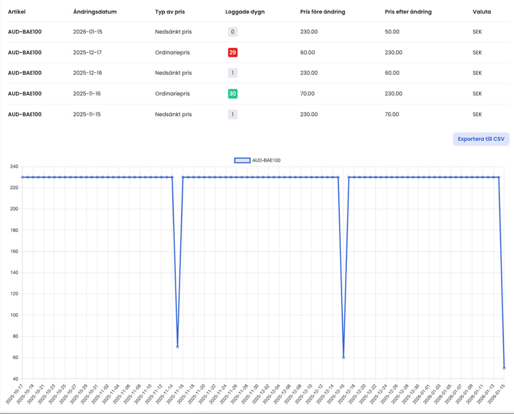Prishistorikvyn har förtydligats för att visa hur länge en produkt haft ordinarie respektive nedsatt pris. Antal loggade dagar visas nu med färgmarkering: